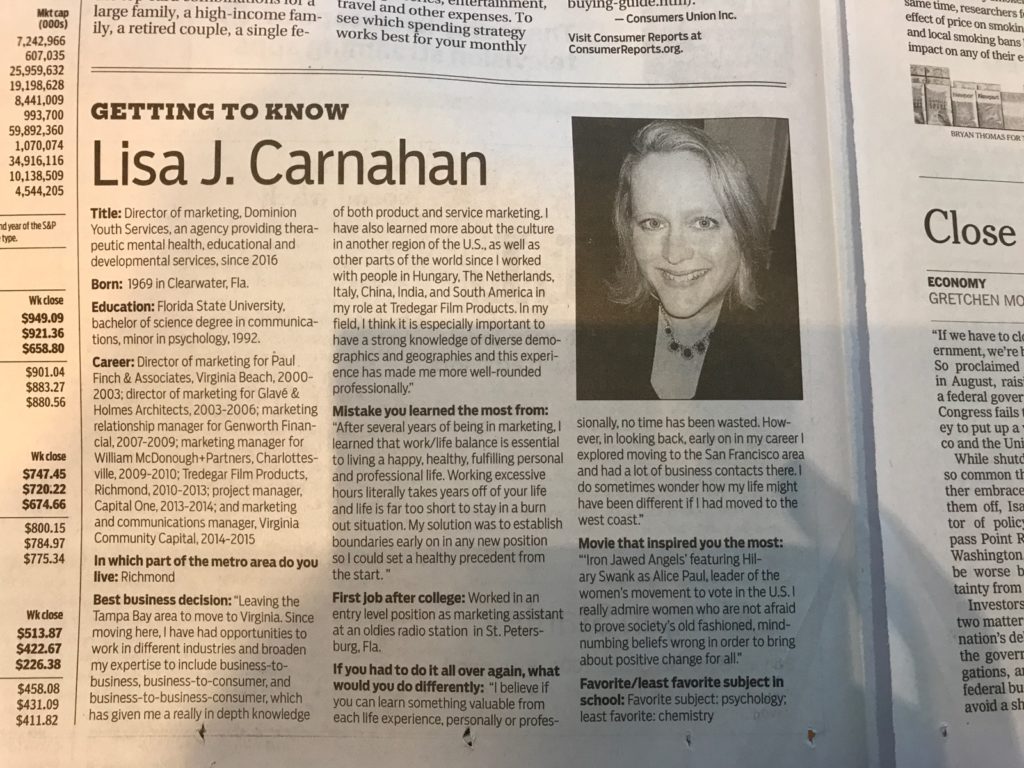 The Richmond Times-Dispatch published an article about our Marketing Director, “Getting to Know Lisa J. Carnahan”, on September 2, 2017. Congrats, Lisa! Check out the article here.